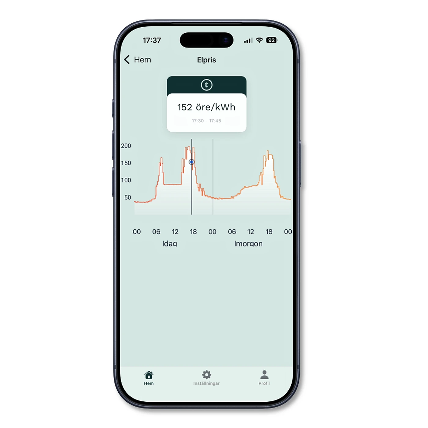 Effira OPTi anpassar automatiskt uppvärmning och varmvatten efter ditt elpris – så du slipper hålla koll själv. I appen kan du ändå följa elpriset timme för timme, både för idag och kommande dygn, och använda informationen för att planera annan elanvändning smartare.