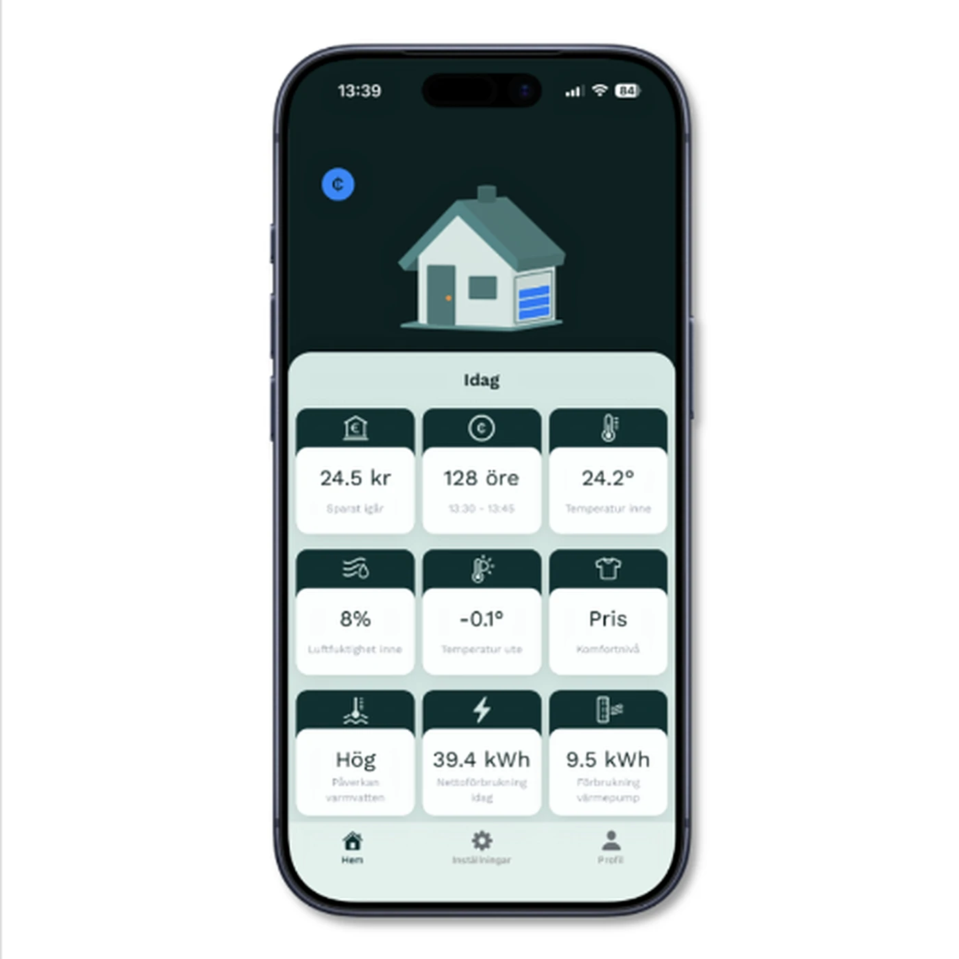 På startsidan ser du allt du behöver: dagens besparing, elpris och hur ditt värmebatteri laddas – medan OPTi sköter allt automatiskt i bakgrunden.