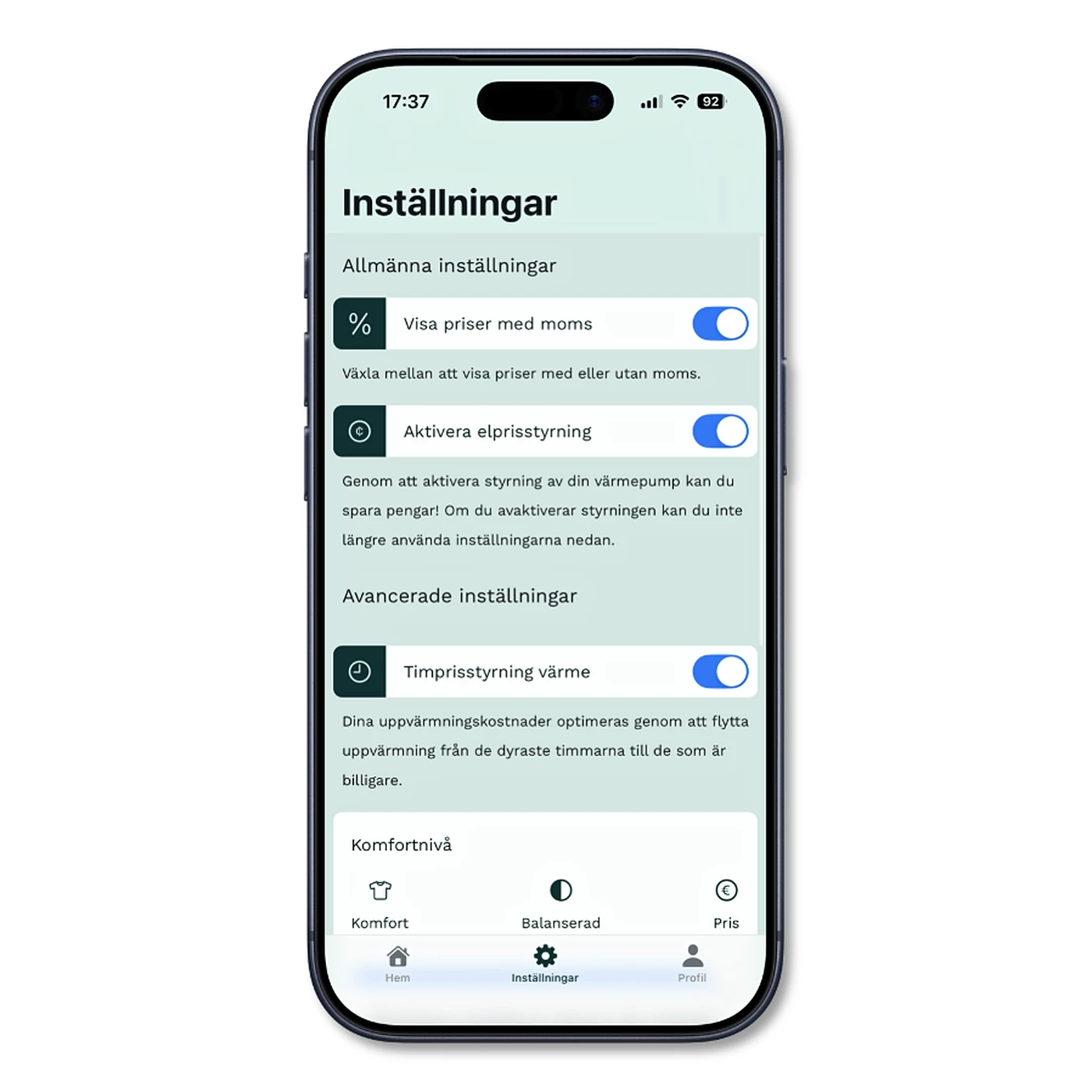 I appen kan du enkelt välja hur aktiv styrningen ska vara och vilken komfortnivå du föredrar. När allt är inställt sköter OPTi arbetet i bakgrunden – så att du får maximal besparing utan att tumma på bekvämligheten.