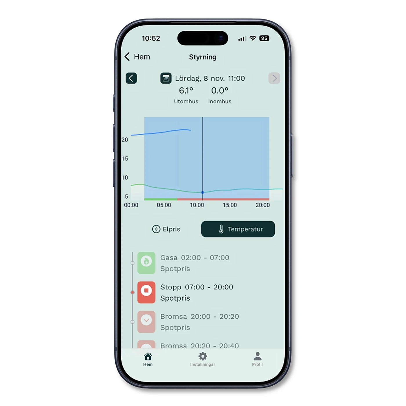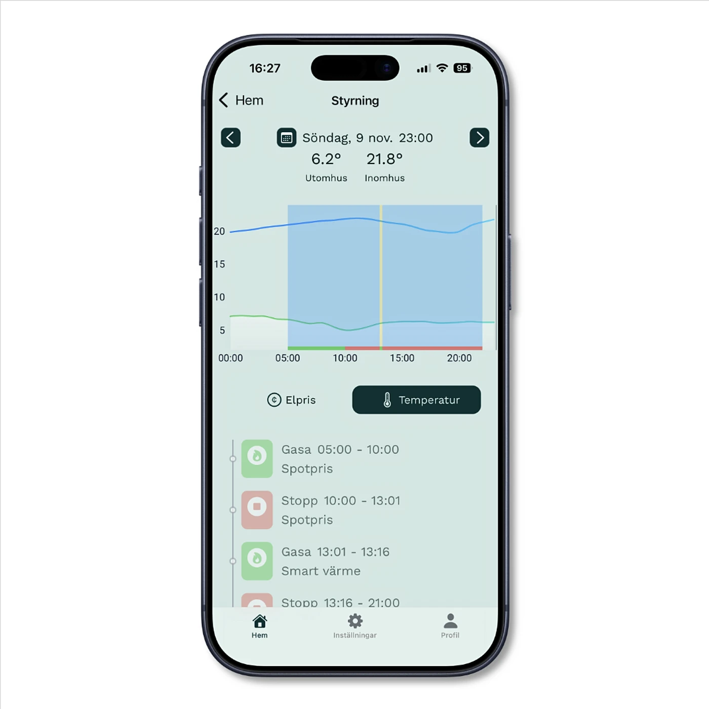 I appen ser du hur temperaturen utvecklas över dygnet och får full kontroll över inomhusklimatet i ditt hem. Allt sker automatiskt i bakgrunden – för ett jämnt, behagligt och energieffektivt inomhusklimat, utan att du behöver göra något själv.