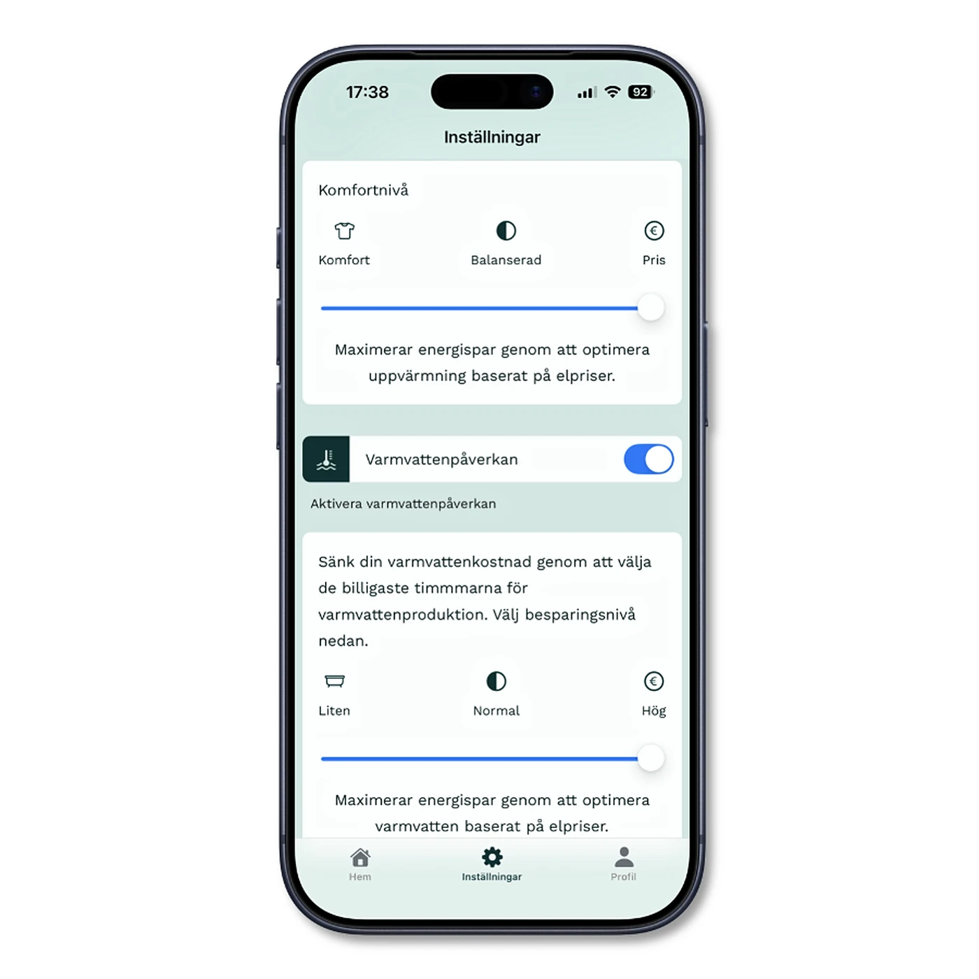 OPTi planerar automatiskt när varmvatten ska produceras för att maximera besparingen, utan att tumma på komforten. I appen kan du enkelt välja balansen mellan komfort och prisoptimering – ju mer du optimerar, desto större blir besparingen.