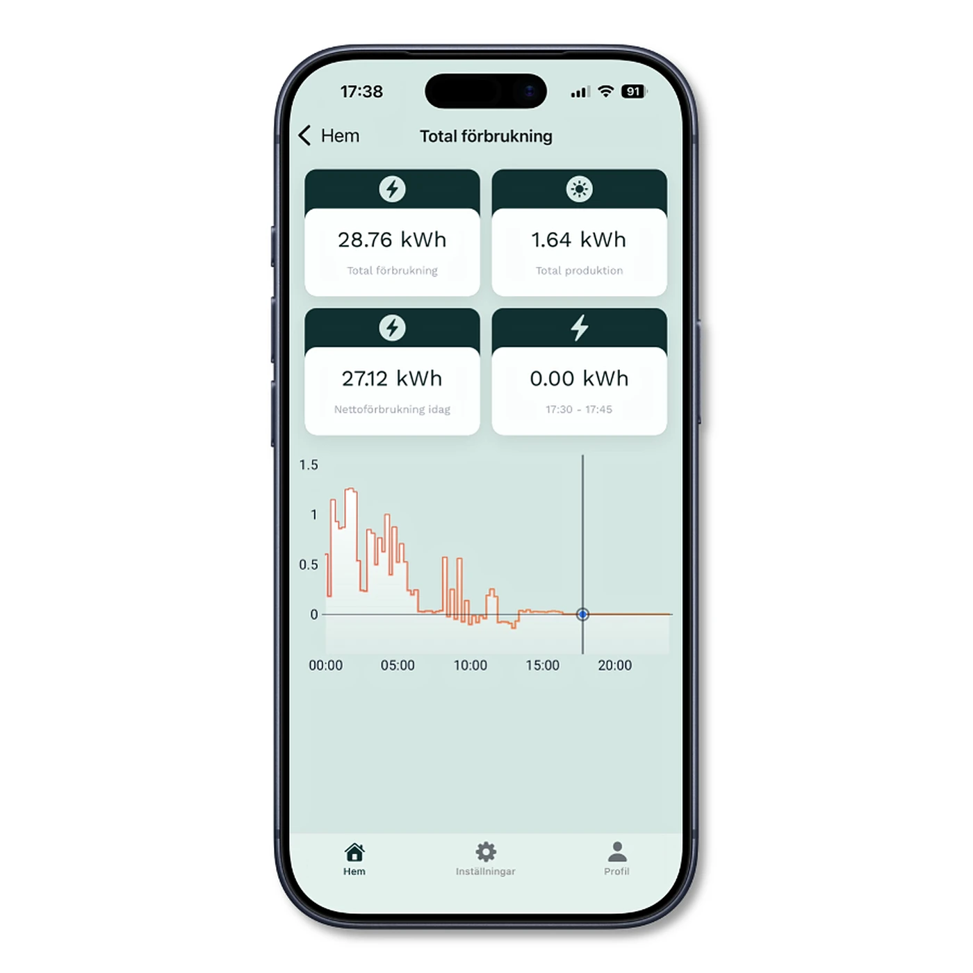Det ger en mer träffsäker styrning, automatisk hantering av effekttoppar och lägre elkostnader. I appen ser du hushållets energiförbrukning timme för timme. Har du solceller visas även egenproduktion och eventuellt överskott – medan OPTi sköter styrningen automatiskt i bakgrunden.
