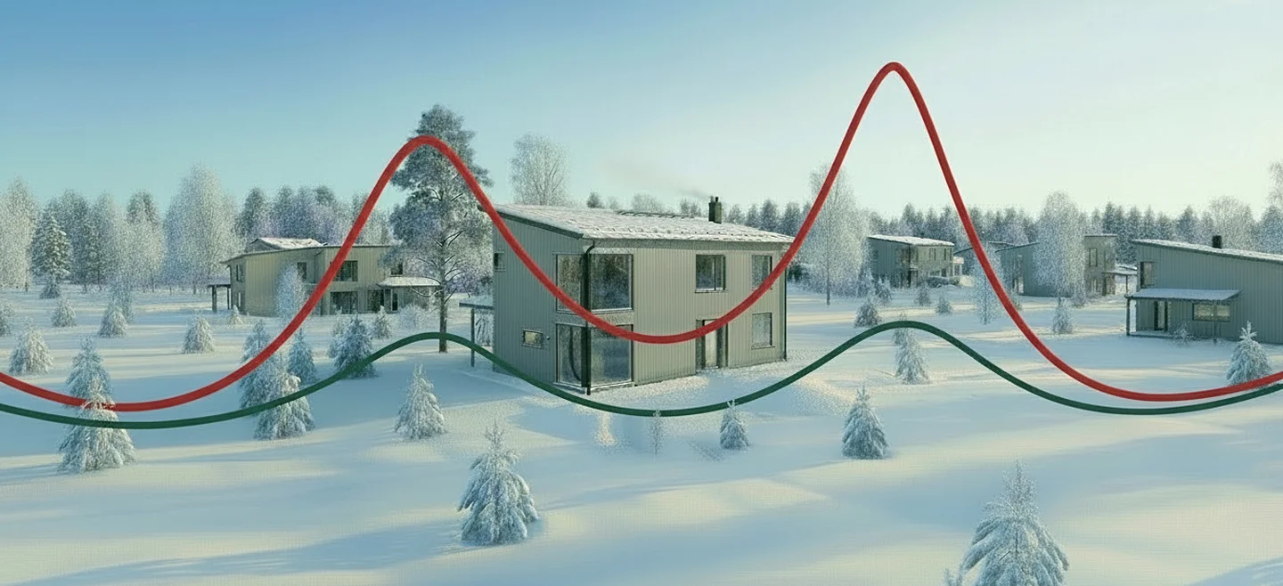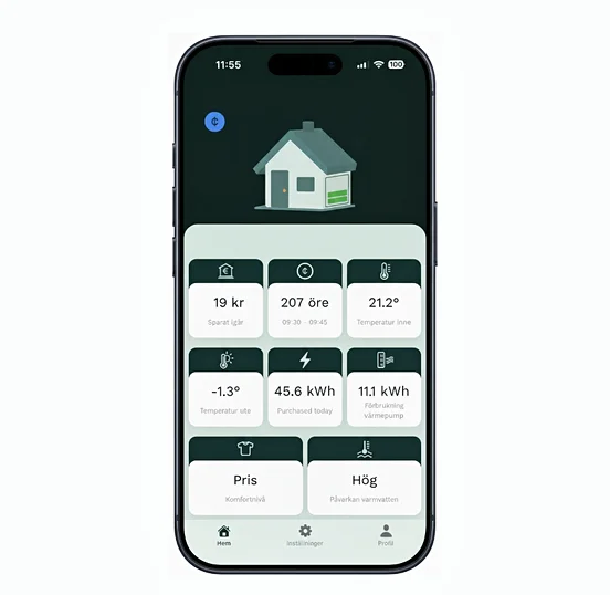 När elen är billigare värms huset upp något mer, och när priset stiger låter systemet värmen sjunka inom komfortzonen. Resultatet blir samma jämna inomhusklimat som tidigare – men till lägre elkostnad.